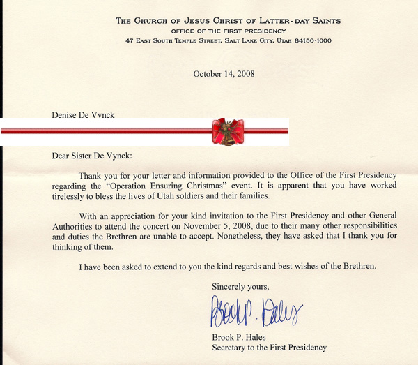 09/25/08 LDS Church Military Missionaries office that sends out retired military couples to support our LDS military just offered 800 "Sharing Time" Ocapella singles with children CD for our troops this Christmas. Thank you |