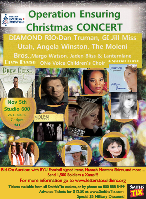 DVDs. NEWAYS Natural Personal Care Products that donated Shampoos, Conditioners, Lotions, Shaving Creams and Deodarants for 150 soldiers (950 total) last year has pallets of products sitting in the warehouse waiting."3 pallets are ready in their warehouse for pick up" if anyone has way to pick up for us and take to UPS location in SLC that has volunteered to package all 1,500 boxes! TAHITIAN NONI has offered pallets of Soft Noni Chews and will drive them from their warehouse to where we need it. Richard Paul Evans and Associates, The 5 time Best Selling Author of The Christmas Box, has offered to donate 1,000 paperback copies of "The Christmas Box" books they will be dropping off to our location. Many wonderful moms are making items like: Gina in We need 1,500 Christmas Stockings hand made preferably. Miniature Christmas trees with lights and decorations, Christmas Card making supplies, wrapping paper and more. *If you are able to volunteer or donate to this Huge and Special effort, please contact us at info@letterstosoldiers.org (appts. for warehouse drop offs: "RCWilley" SLC RC Willey warehouse accepting donation drop offs of items. The Christmas Concert Nov. 5th DVDs will be available for minimum donation of $25 soon. Get your orders in at to raise the $10,000 more we need to pay for