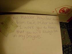 I also left one of the cards open (feel free to read it). They all say basically the same thing, and I thought you might be able to use those with care packages or whatever. You're the expert on this, so I'm happy with however you send them.