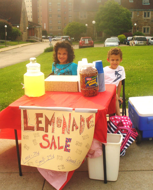 "I had an excellent experience this weekend with two wonderful children – 8 and 6 years old. They knew there was going to be a parade for memorial day in Munhall and wanted to set up a lemonade stand to raise money for the soldiers in Iraq. The older child had learned a little about what was happening in Iraq, and thought it would be a perfect memorial day fundraiser. She also convinced her grandmother and myself to match whatever she raised. We collected all the supplies, made all of the products and set up in front of St. Therese. The kids made a great lemonade sign, decided on the prices of our small medium and large cups and also decided to make a snack cup – a Styrofoam cup filled with pretzels. It was not only a great learning experience for them, but it also showed them what it felt like to raise money for people in need. They saw how hardly anyone asked for change, even when they paid us with a $20 bill. They continually said “It’s for a good cause, keep the change”. The kids were overwhelmed with their success and now want to set something up again for the 4th of July. We took a few pictures too. We decided we wanted to donate to your organization and although we could just send the money over paypal, I thought maybe I could take them to the store and they could use the money to make a care package of their own. Would there be somewhere we can ship a care package to, by following the guidelines of what is needed? Any information to get us started would be great.